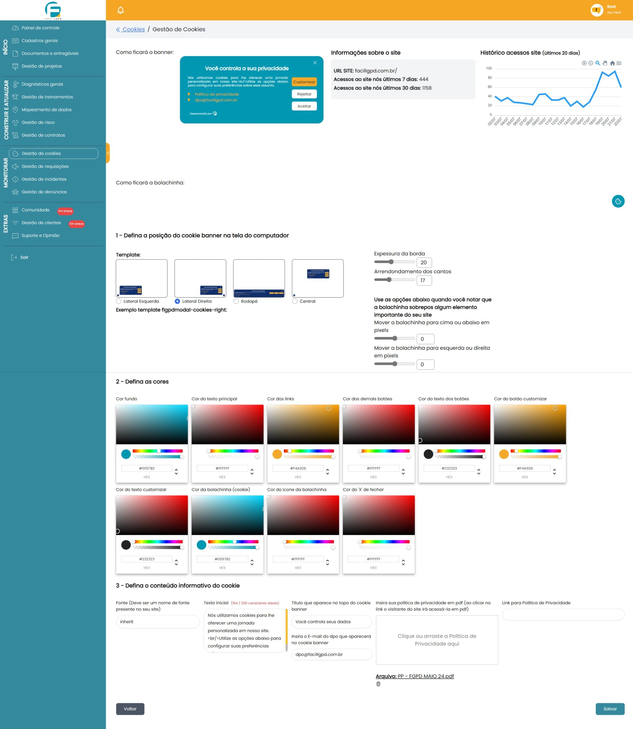 Nosso produto permite personalizar o texto, cores, posição e estilo do banner de cookies para que ele se integre perfeitamente ao design do seu site. Você pode ajustar as configurações através de um painel de controle intuitivo.